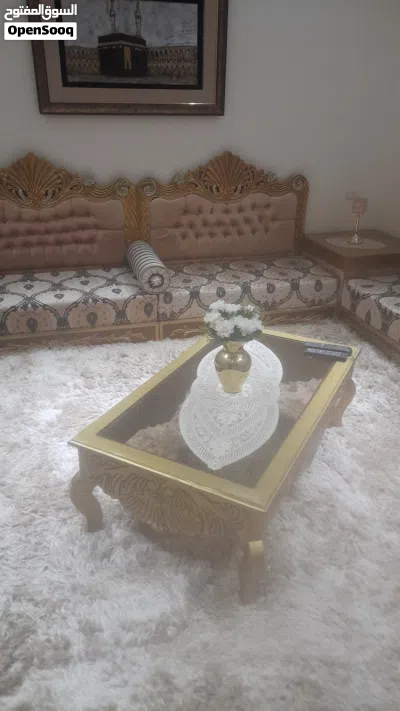 جلسه مغربيه تفرش اربعه في اربعه وزوز زاويه طاوله وفراش وستار بيع كامله